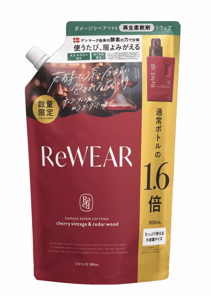 4日で完売*した再生柔軟剤「ReWEAR(リウェア)」から、秋冬限定品が登場!ホリデーシーズンを彩る、芳醇な赤ワインの深い余韻と至福の香り「チェリーヴィンテージ&シダーウッド」新発売