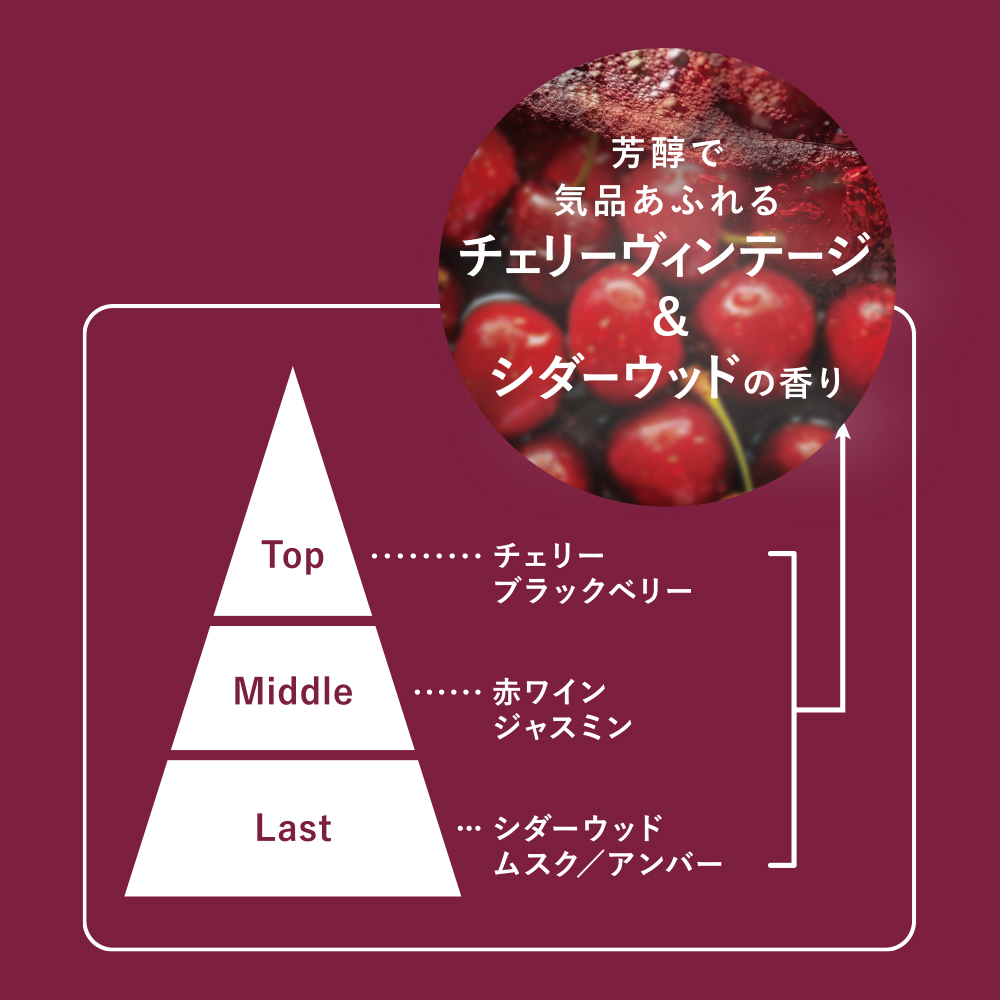 フルーティーなチェリーやブラックベリーに、深みのある赤ワインが合わさり、シダーウッドとムスクが柔らかく残る、芳醇で気品あふれる至福の香り。深い余韻に包まれ、ゆっくり味わいたくなる香りはホリデーシーズンをよりいっそう彩ります。