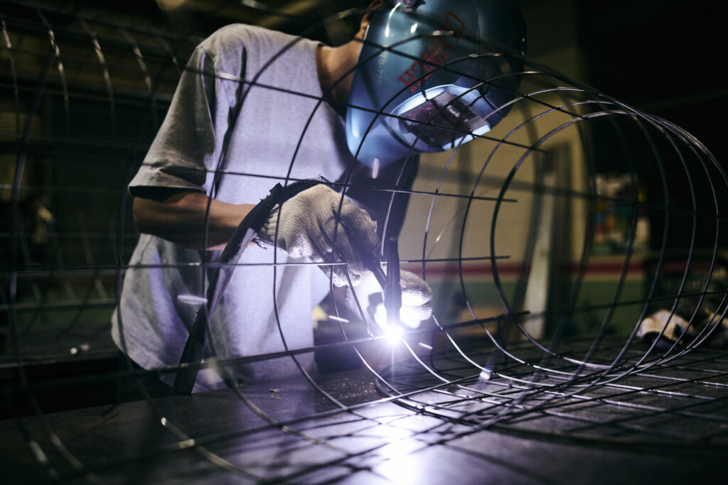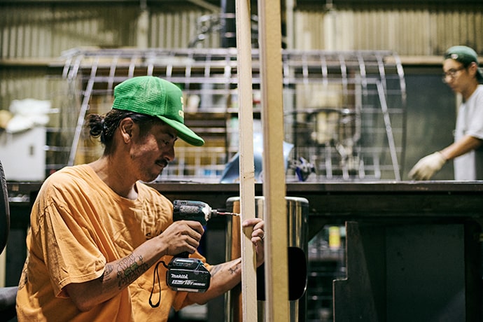 オブジェの形状は、SALONIAの高機能プレミアムモデル「スムースシャインドライヤー」をイメージしてデザイン。手作業でドライヤーの形状を再現しつつ、骨組みの中に小型家電を入れるため、構造設計の強度も計算して製作しました。スムースシャインドライヤーの、陶器のように上質な手触り感を再現すべく、アイアンの骨組みはブラックに塗装しマットな質感に仕上げました。