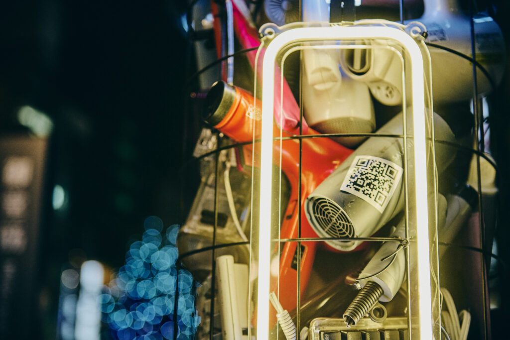 今回のプロジェクトは「環境も、お客様も、もっと美しくなってもらいたい」というSALONIAの想いを、屋外の巨大オブジェを通じて、より多くの方々に知っていただくために行いました。高さ約3メートルの巨大ドライヤーオブジェの中には、100台以上の“捨てられるはずだった”小型家電が入っています。これは、リサイクルされた資源が新たなものを形づくることを表現しています。