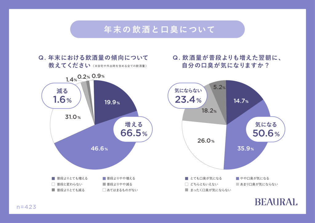 質問「年末における飲酒量の傾向について教えてください※自宅や外出時を含める全ての飲酒量」に対して、66.5%が「増える」と回答しました。さらに、質問「飲酒量が普段よりも増えた翌朝に、自分の口臭が気になりますか?」に対して、50.6%が「気になる」と回答しました。