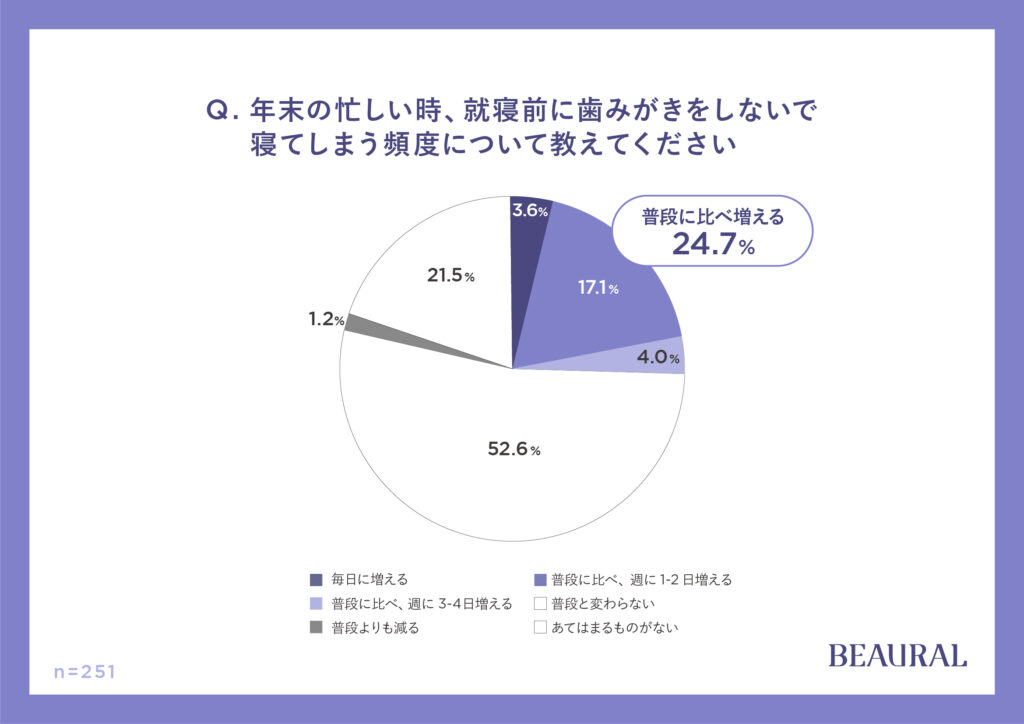 「年末に忙しくなる」という人を対象とした質問「年末の忙しい時、就寝前に歯みがきをしないで寝てしまう頻度について教えてください」に、24.7%が「普段に比べ増える」と回答しました。その理由は*2、「気付いたら寝てしまっていたため」が58.1%と最多の回答となりました。次いで「飲み会により、帰宅が遅くなるため」「飲酒により、歯みがきが面倒に感じるため」が35.5%、「繁忙期により、帰宅が遅くなるため」が33.9%でした。眠気に勝てないだけでなく、年末ならではの事情により<歯みがきキャンセル1>をしてしまうことが分かりました。