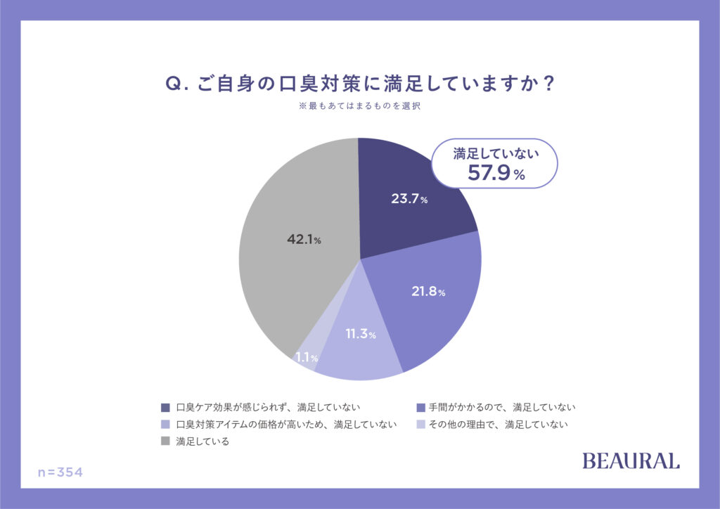 「飲酒やストレスにより口臭が気になる時、口臭対策を行っている」という人を対象にした質問「ご自身の口臭対策に満足していますか?※最も当てはまるものを選択 」に、「満足していない」という回答が57.9%にのぼりました。そのうち「口臭ケア効果が感じられず、満足していない」が23.7%、「手間がかかるので、満足していない」が21.8%となりました。