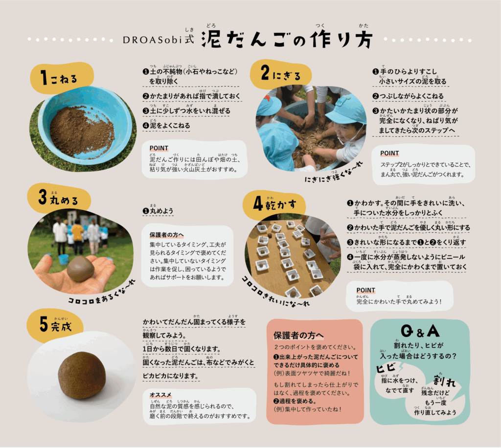 誰でも簡単にワークショップを開催できる教材セット(絵本・泥だんごの作り方・ワークショップの手引)をDROASブランドサイトで無料公開しました。私たちの生活と密接な泥について絵本でわかりやすく学び、五感を使った泥だんご作りから自然との一体感を得ることで、豊かな人間性の獲得が期待できます。本教材セットは、泥だんごによる幼児教育を含めた環境教育に注力する島根大学教育学部の松本一郎教授監修のもとで新たに開発・制作したものです。