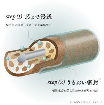 ・ヘマチン1(内部補修):髪を包むように密着し、ダメージを内側まで補修。 ・トステア2(うねりケア):髪の内部へ浸透し、湿気やダメージによるうねりを抑え、指通りの良いサラサラ髪へ。
