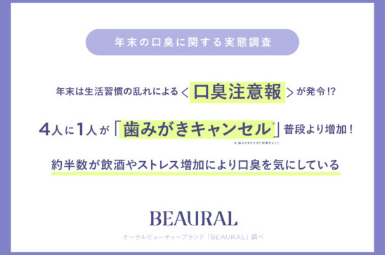 【調査】 年末は生活習慣の乱れによる<口臭注意報>が発令!?4人に1人が「歯みがきキャンセル*」普段より増加!約半数が「飲酒やストレスの増加による口臭」を気にしている